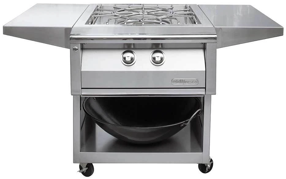 The Alfresco 24″ VersaPower Cart is used to transform your built-in VersaPower cooker into a freestanding unit. All stainless steel construction with four heavy-duty casters make it perfect for making your cooker portable.