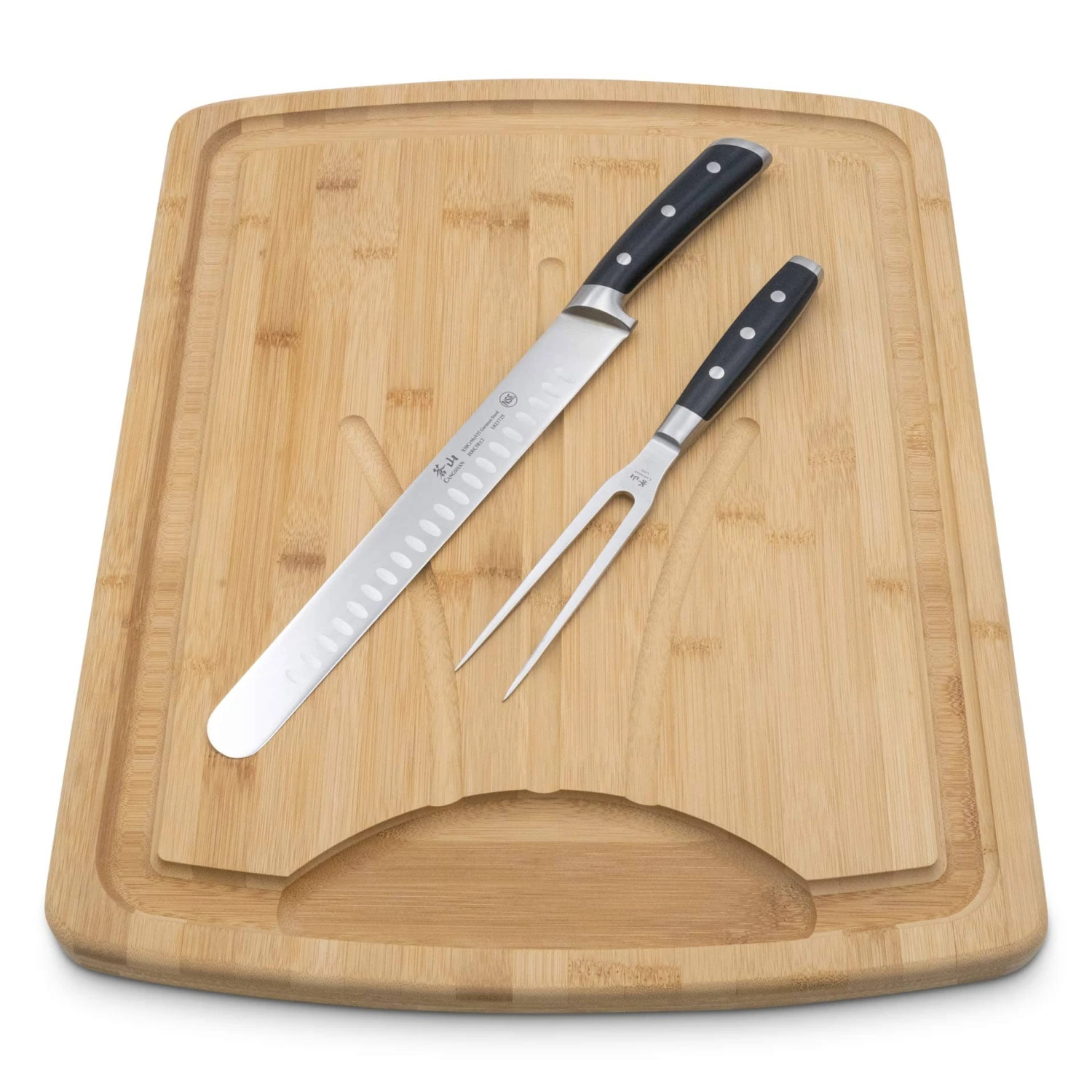 Offers plenty of surface size for carving large cuts of meat or several items at once. On one side, it has generous grooves and a collection well to catch juices. The other side has carrying curves with no groove – perfect for presentation or use as a dough board. Bamboo in this pattern is gentler on knife blades than other types of wood and tends to show fewer cut marks which makes it a great serving piece.
