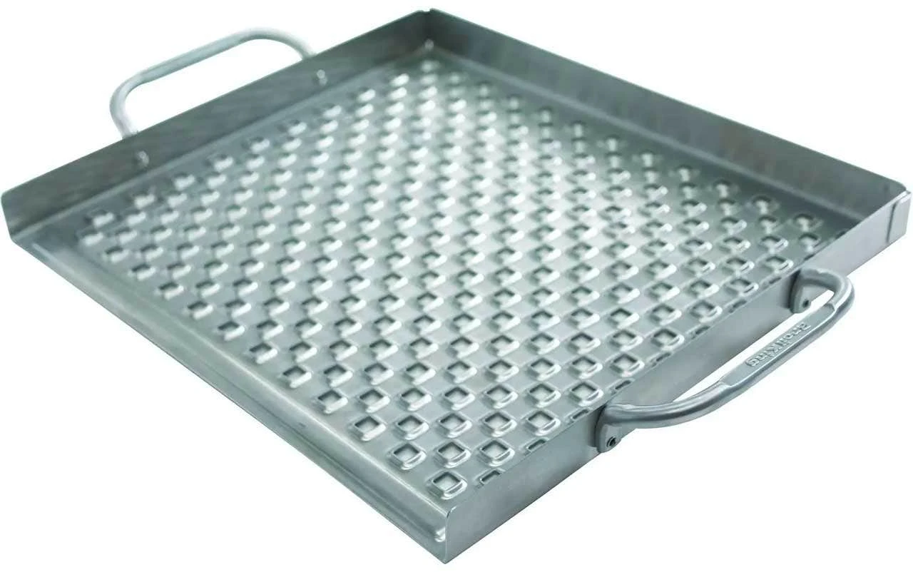 Constructed from 1.2mm high grade stainless steel. Its oversized design gives you more cooking space while its raised frame keeps foods contained within the topper cooking surface. The oversized stainless steel 10mm handles with forged Broil King® logo makes it easy to transport to and from the grill. The raised square perforation holes add to the rigidity of the design and help keep food from sticking. The flat grill topper is dishwasher safe.