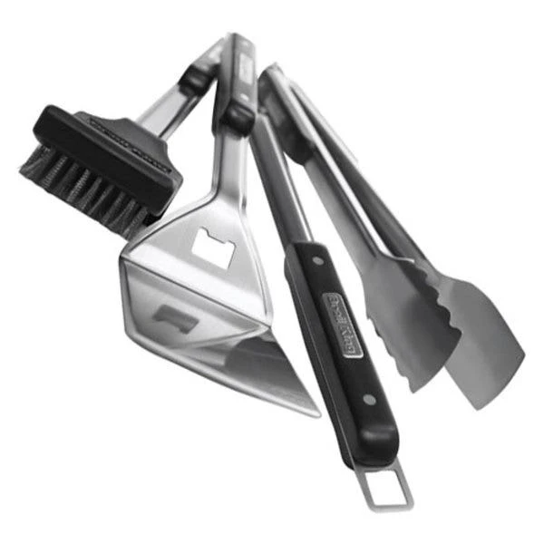 Features a durable design tough enough for even the most demanding griller. Large Bakelite handles with sleek stainless inlays, over extra thick 1.8 mm stainless steel one piece tools; the ideal fusion of functionality and durability. Set includes a turner, locking tong, silicone basting brush, and barbecue grill brush.