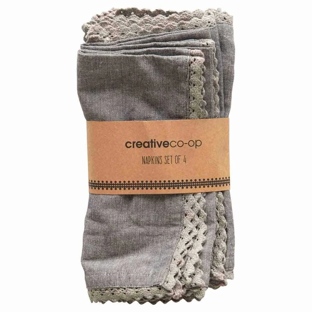 Four 18″ square cotton napkins with lace trim in charcoal. Perfect gift for weddings or birthdays, or treat yourself.