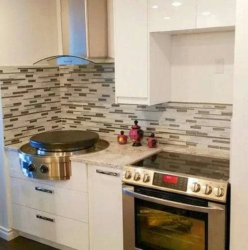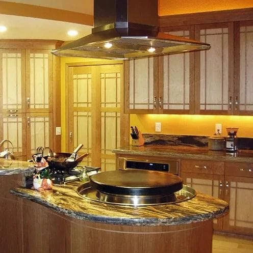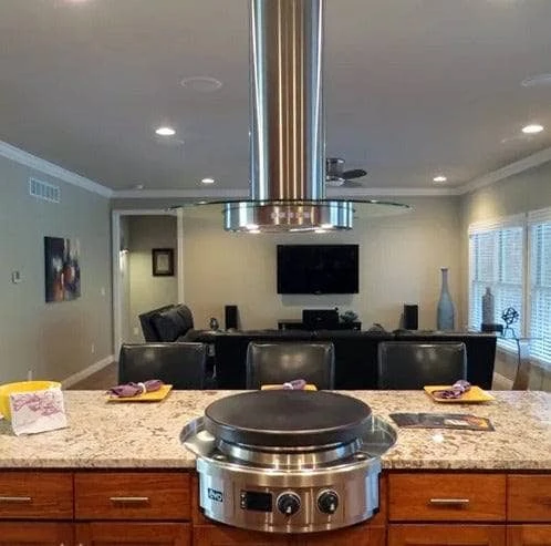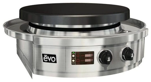 Independent heat adjustment across inner and outer cook surface zones for managing a wide range of menu possibilities. Surface temperatures range from 150ºF to 300ºF (66ºC to 149ºC) from the center to the outside edge (optional user enabled temperature of 150ºF to 550ºF (66ºC to 288ºC) are available). Operating on 208V – 230V the Affinity 25E Cooktop is an ideal solution for any indoor display cooking venue. 25″ (635mm) diameter black seasoned steel cook surface