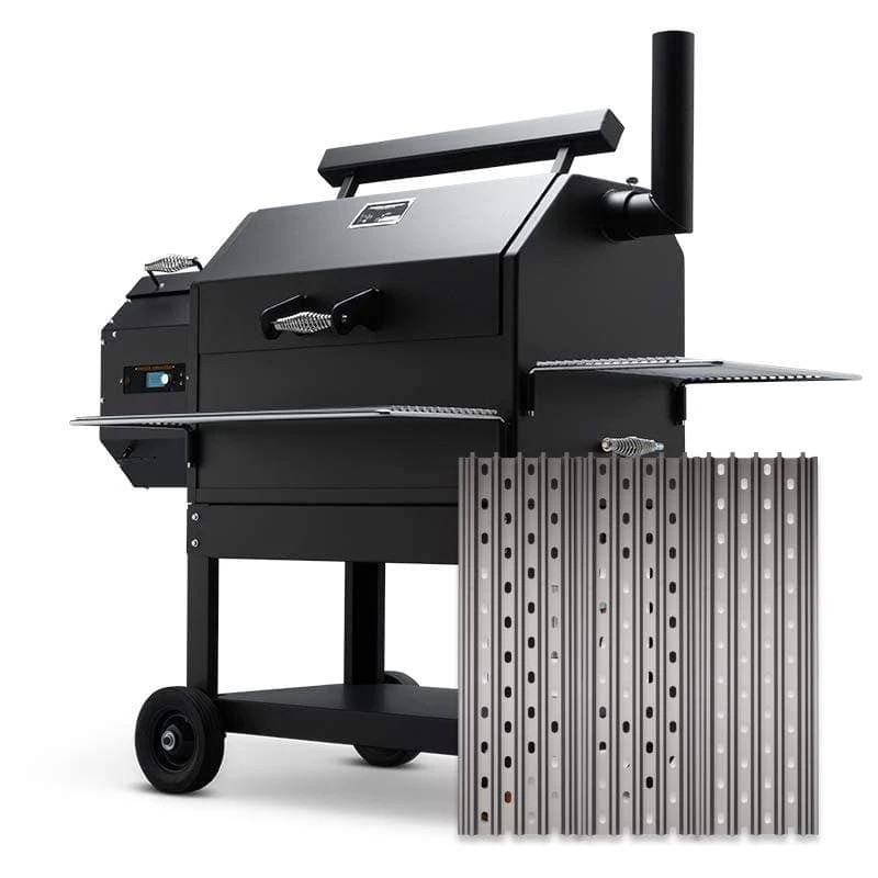 Anodized aluminum grill grate package for Yoder Smokers Pellet Grills. When fit with this package, the grate temperature on the left side soars past the 650-degree mark and produces those coveted steakhouse quality grill marks, fast cooking times, intense caramelization, color and texture common to cooking over an open fire or gas fired grill.