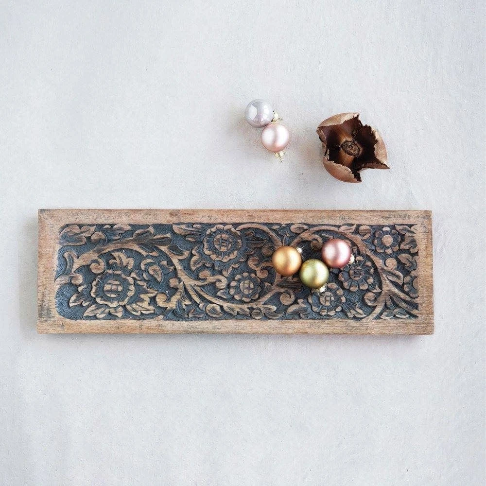 This Hand-Carved Mango Wood Tray with Floral Motif is perfect for displaying and serving foods at any holiday party or dinner. Made out of hand-carved mango wood, this tray features a floral design and lends itself perfectly to a festive home. This piece serves both friends and family in a unique style.