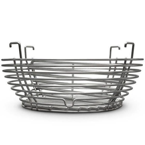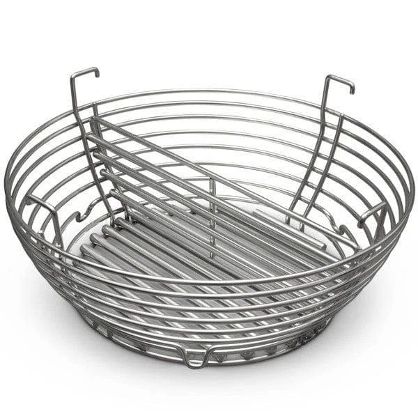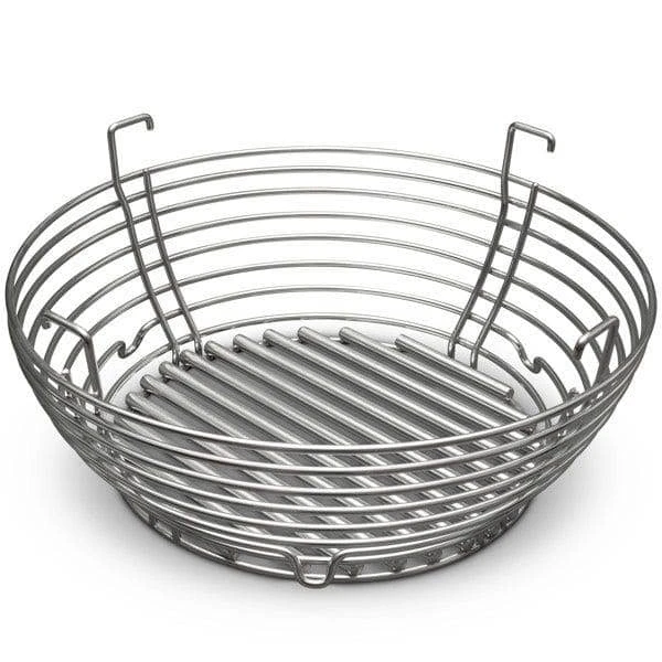 Upgrade your Kamado Joe Classic or Large Big Green Egg cooking experience with the Kamado Joe stainless steel charcoal basket. The design of this piece has several purposes. First, it makes cleanup simpler by providing a localized place for your lump charcoal. Second, it improves airflow by lifting charcoal vertically and allowing more air to travel around the area which increases temperature control. The stainless basket has a removable partition. Use the partition to cook indirectly or build a smaller charcoal fire. Remove the partition to cook directly. Built of heavy stainless steel to withstand direct fire cook after cook.
