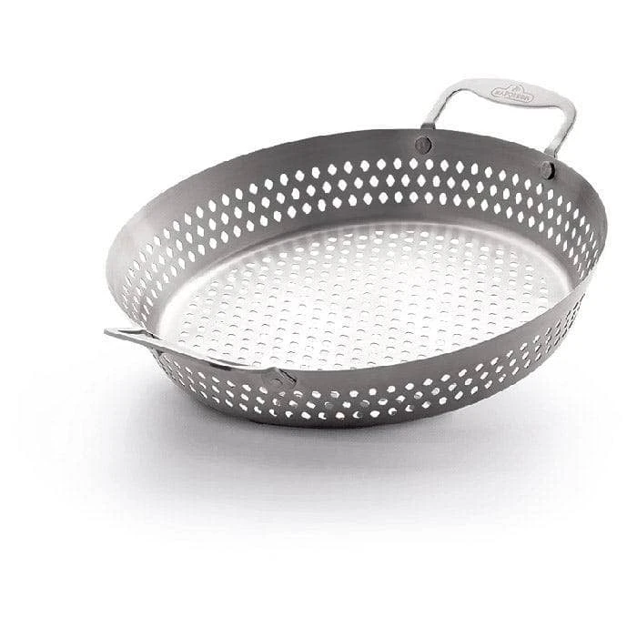 Perfect for grilling veggies, stir-fry or seafood – keeping it all contained without slipping through your grates. The holes throughout the wok allow smoke and flavor to permeate food. Use over a side burner or directly on your grill.
