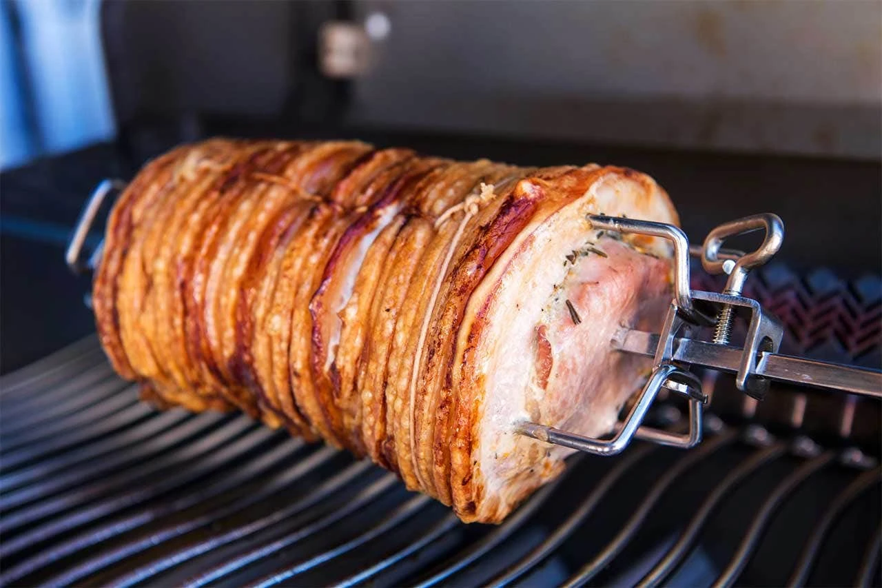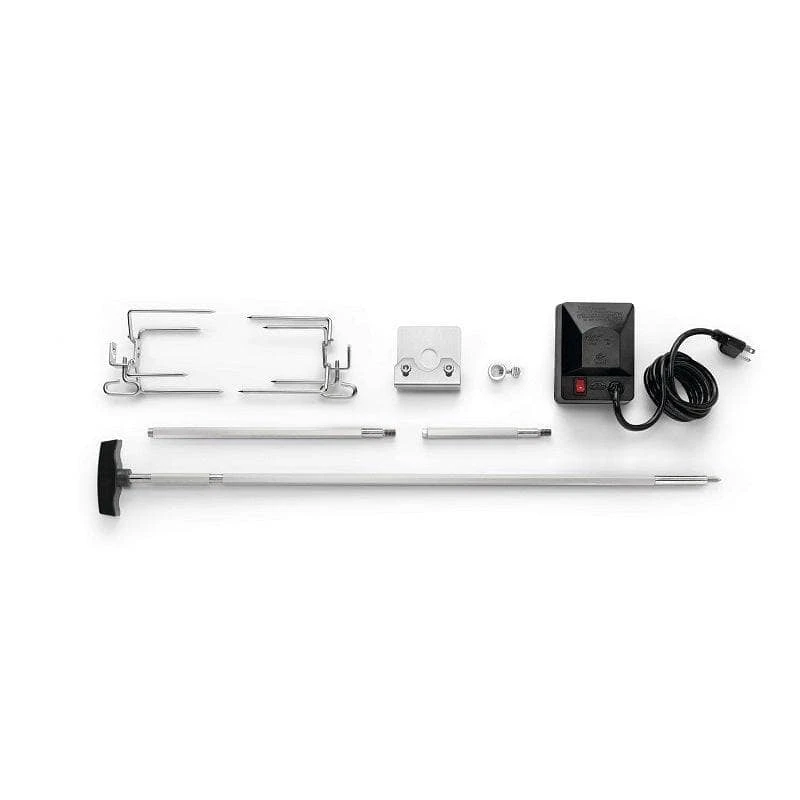 Napoleon Rogue Universal Heavy Duty Rotisserie Kit for all Rogue 365/425/525/625 models. This multi-piece rotisserie kit is made with food grade stainless steel. The heavy-duty motor can turn up to twenty-six pounds of a balanced load. The square spit rod and two four pronged forks securely holds to spit roast, and they tighten securely with easy to use thumb screws.