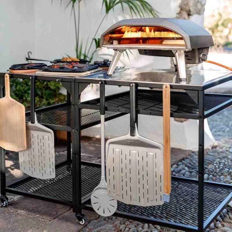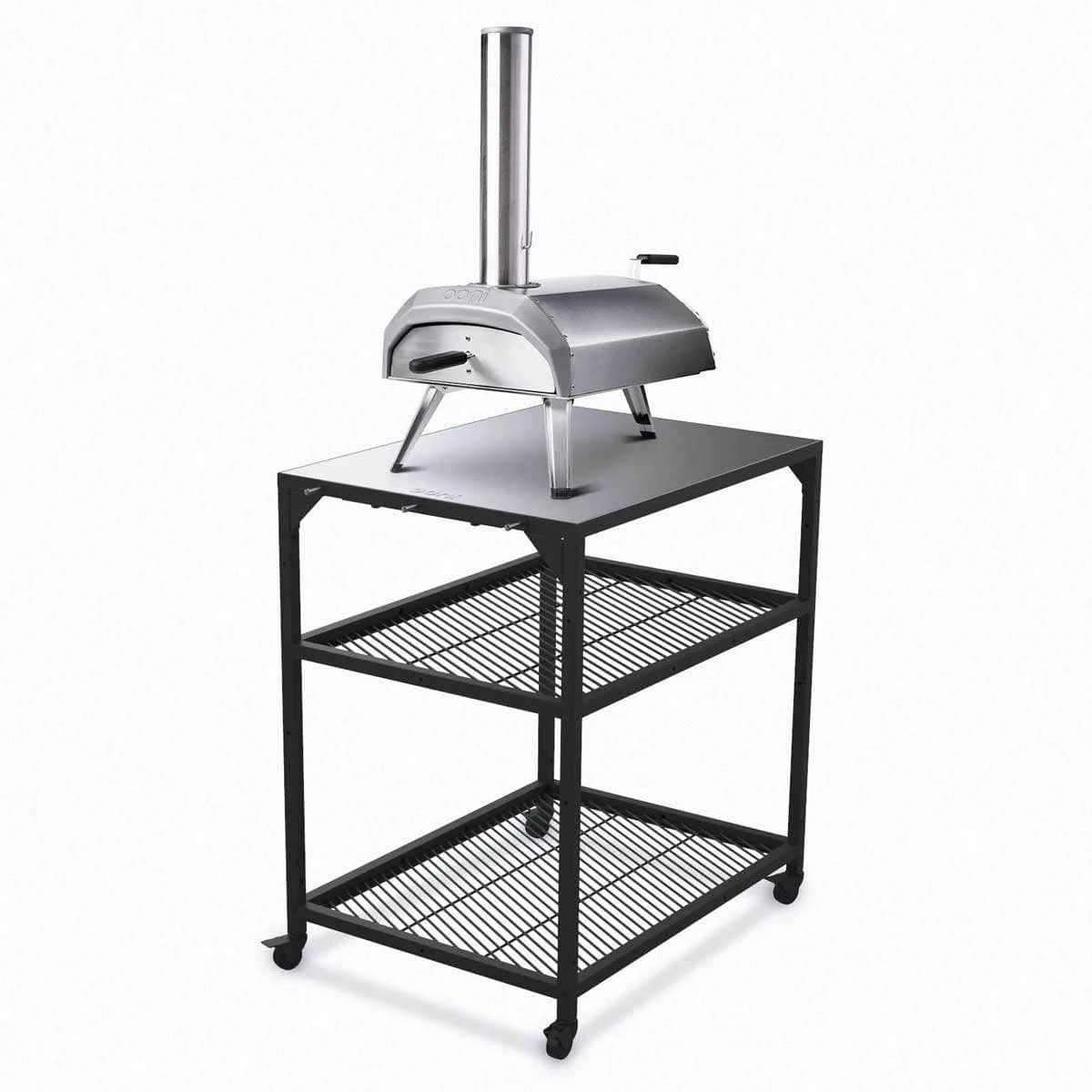 The perfect surface for your pizza oven and accessories. All Ooni pizza oven models fit on the stainless steel work surface, and your propane tank will fit on the lower shelf. Tables are made of powder-coated carbon steel. They also feature two height-adjustable shelves and built-in hooks for your Ooni peels and accessories. Plus, the two lockable casters will keep your table steady while you cook.Â