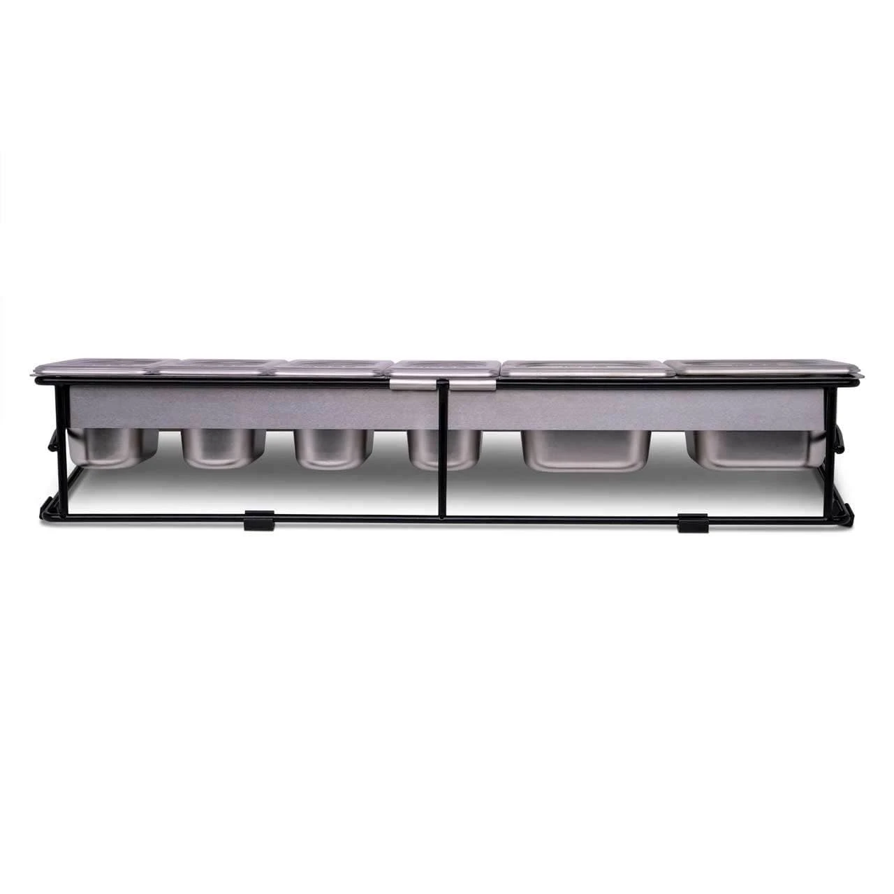 The two (2) 1.6L and four (4) 0.8L Ooni Pizza Topping containers ensure you have plenty of toppings. The custom-fit clear lids for each container means they can be easily stacked and stored in the fridge. The weather-resistant, powder-coated frame and stainless steel cover fit perfectly on our Ooni Modular Tables and it is easy to transport for cleaning and storage. Dimensions: 30.5″W x 9.4″L x 6.3″H.
