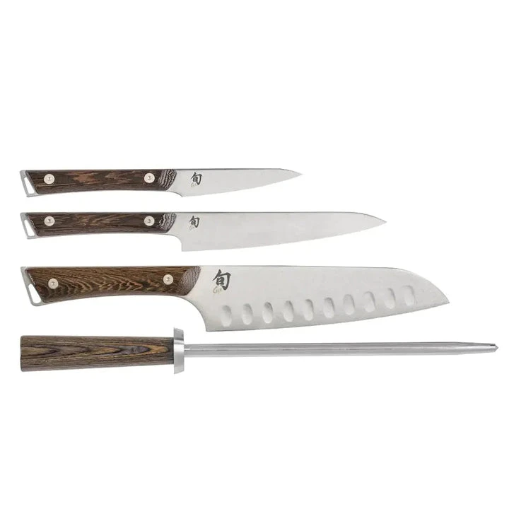 This striking set includes everything you need to elevate your cooking. The Shun Kanso 7-in. Hollow Ground Santoku is the one knife you will probably use every time you cook. The Shun Kanso 3.5-in. Paring Knife, ideal for a complete range of trimming and peeling tasks. Also, includes the Shun Kanso 6-in. Utility Knife for in-between tasks. Also included is the Kanso Combination Honing Steel to maintain your cutlery. This attractive set stores in the Slimline Bamboo Block. It takes up less space on your countertop, yet keeps all your important kitchen knives within easy reach.
