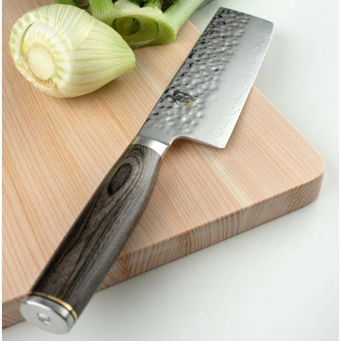 The nakiri is interesting thanks to it’s unique blade shape. Nakiri is Japanese for “vegetable knife” and the new Premier Grey Nakiri is the ideal kitchen knife for slicing and dicing most every fruit and vegetable. The nakiri blade shape is extremely practical with its blunt tip. The nakiri is not rocked like a chef’s knife because of the straight blade, edge, and spine. Use a push cut by moving the knife down and forward while keeping the edge parallel to the cutting surface.