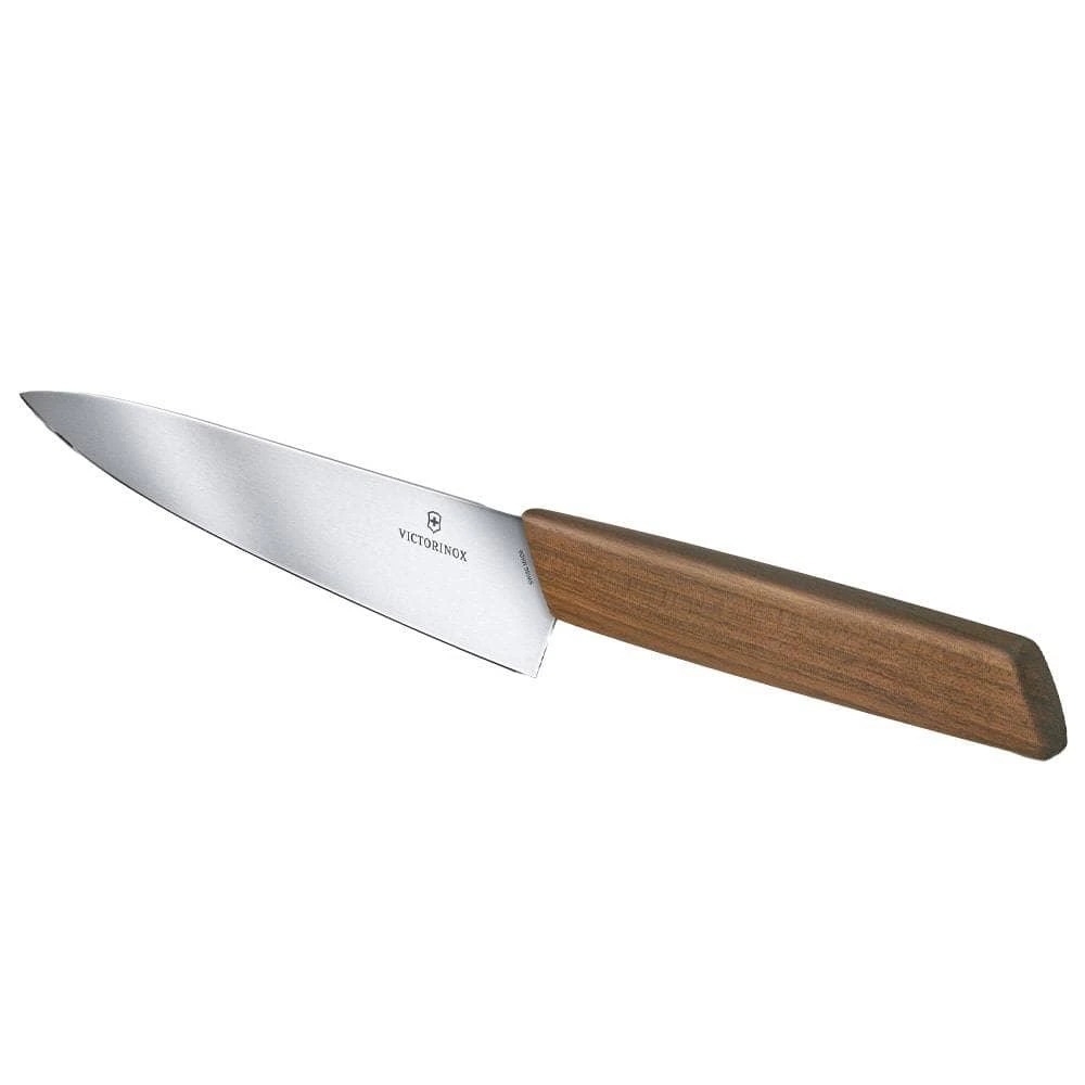 The Victorinox Swiss Modern Collection offers clean lines with unique handles in warm European walnut wood. Ergonomically shaped for comfort. This carving knife is ready to take on any protein, turkeys, brisket and roasts.Â