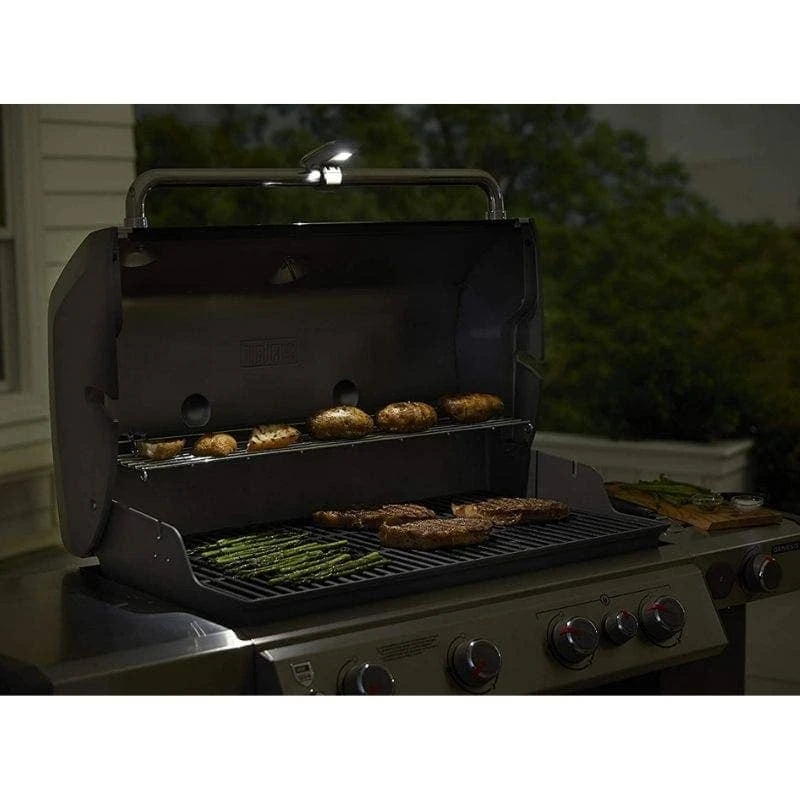 Weber’s Grill ‘N Go handle light illuminates your grilling surface for evening cooks. It clips onto the handle and uses a motion sensor to turn on when the lid is lifted. When the lid is closed, the light will turn off and save battery life.