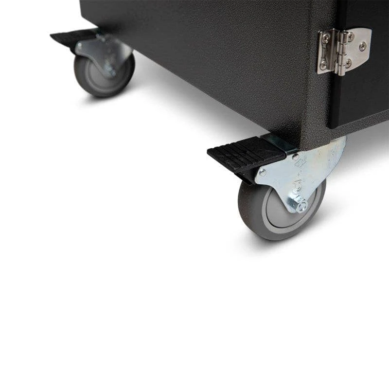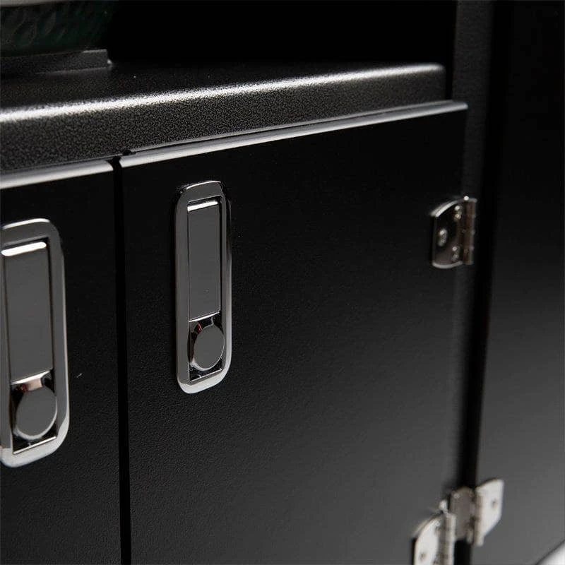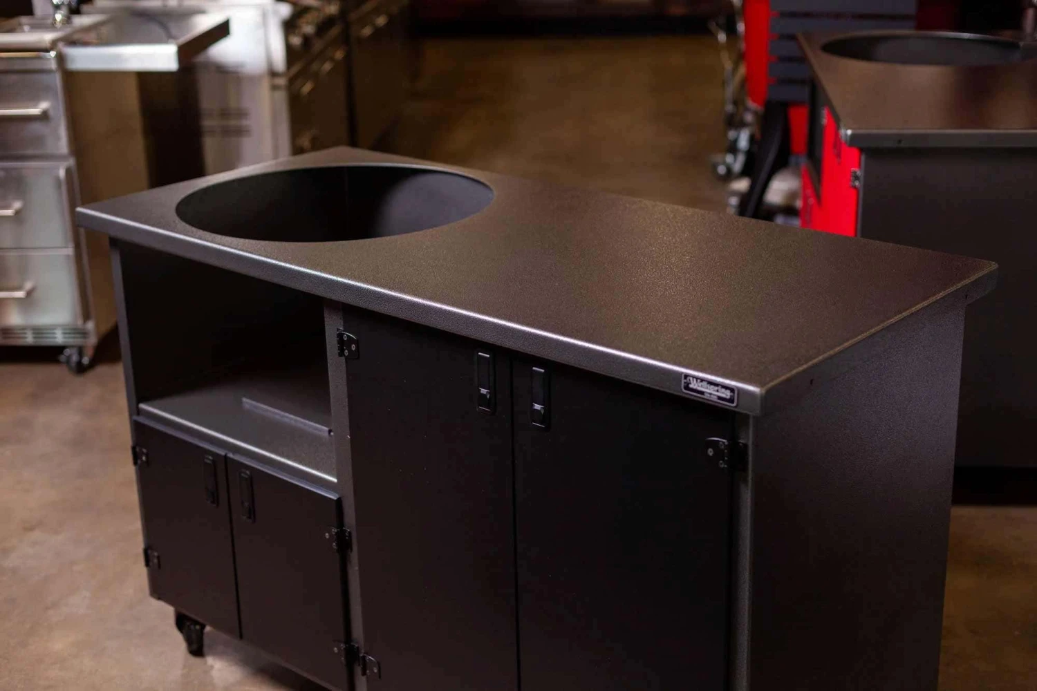 Provides additional prep space and storage for your ceramic grills. The welded aluminum frame is UV & chip resistant powder coated Silver Vein, making durable and lightweight work surface. Storage beneath the cabinet cart is secure behind marine grade polyethylene doors in black. The heavy-duty hardware and two-way locking, 4″ casters complement the rugged construction of the cabinet.