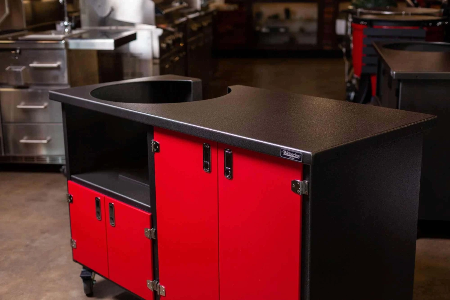 Provides additional prep space and storage for your ceramic grills. The welded aluminum frame is UV & chip resistant powder coated Silver Vein, making durable and lightweight work surface. Storage beneath the cabinet cart is secure behind marine grade polyethylene doors in red. The heavy-duty hardware and two-way locking, 4″ casters complement the rugged construction of the cabinet.
