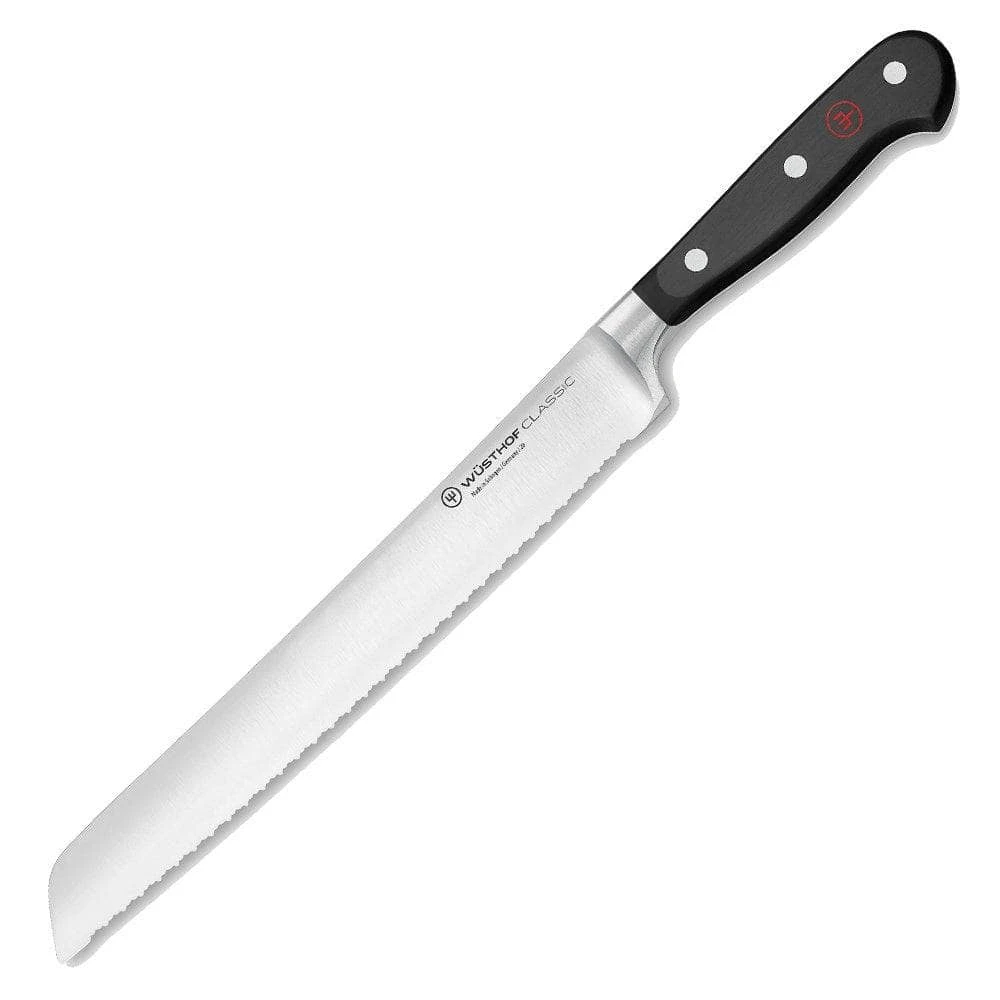 The Classic 9″ Double Serrated Bread Knife has double the number of serrations or a serration within the serration. The design of the double serrated bread knife glides through crusty breads with minimal crumbs without damaging the inside. This knife can also be used on delicate produce or even angel food cake.