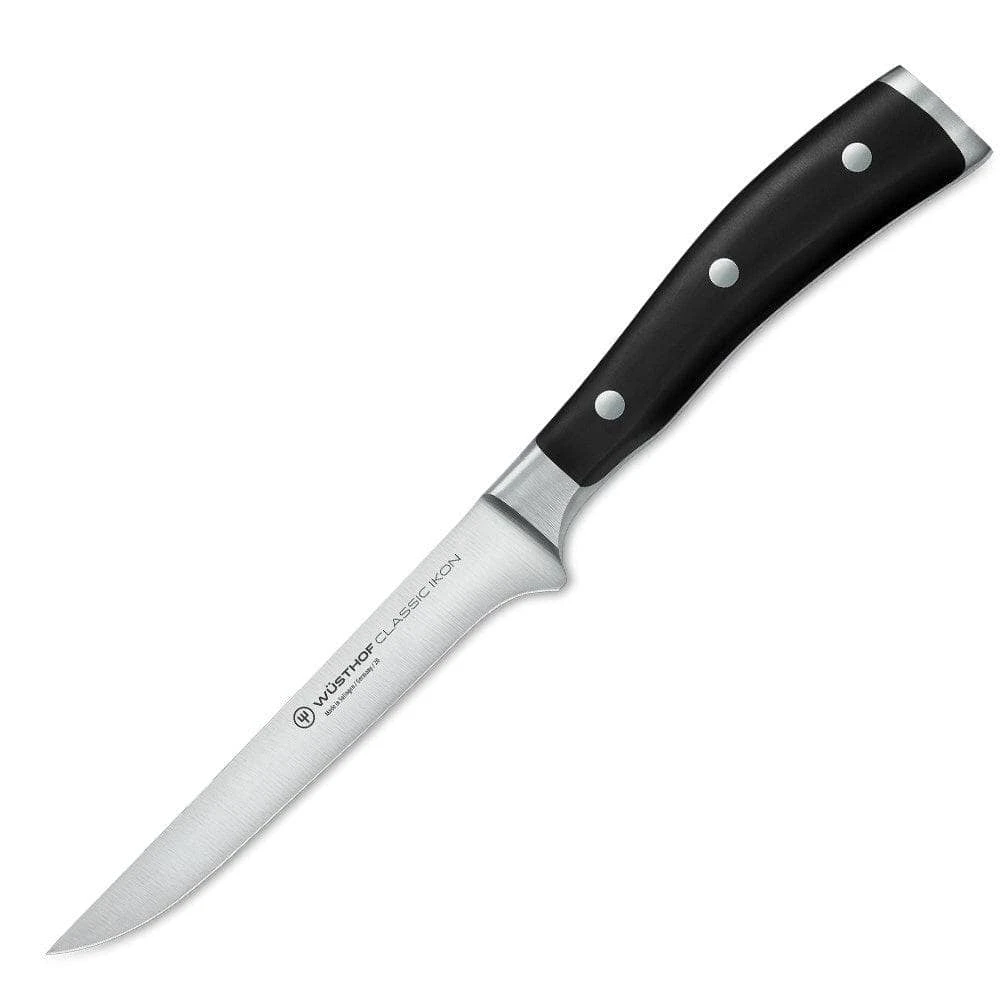 Makes quick work of poultry, pork shoulder and other cuts where you need a precision knife to remove meat from the bone. Crafted with precision from a single piece of stainless steel, this knife features a full tang triple-riveted for maximum strength and control. Its half bolster allows it to be honed from the handle to the blade to maintain sharpness. Its contoured handle ensures a comfortable grip and modern aesthetic. This knife is crafted in Solingen, Germany.