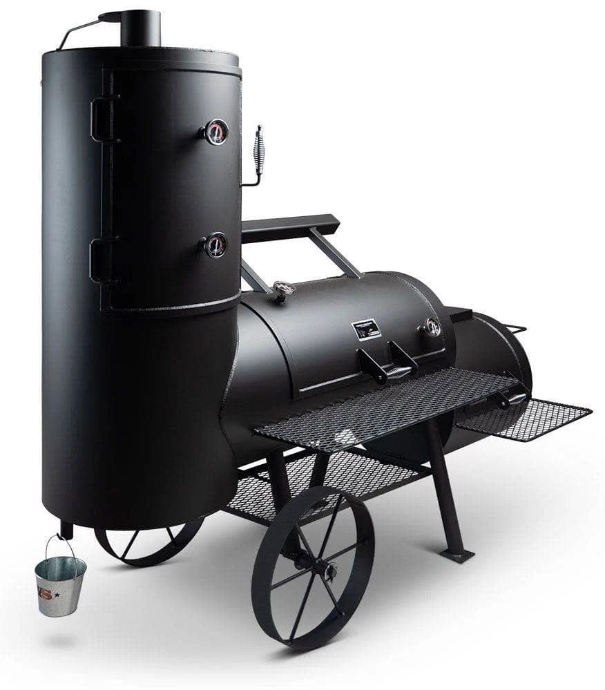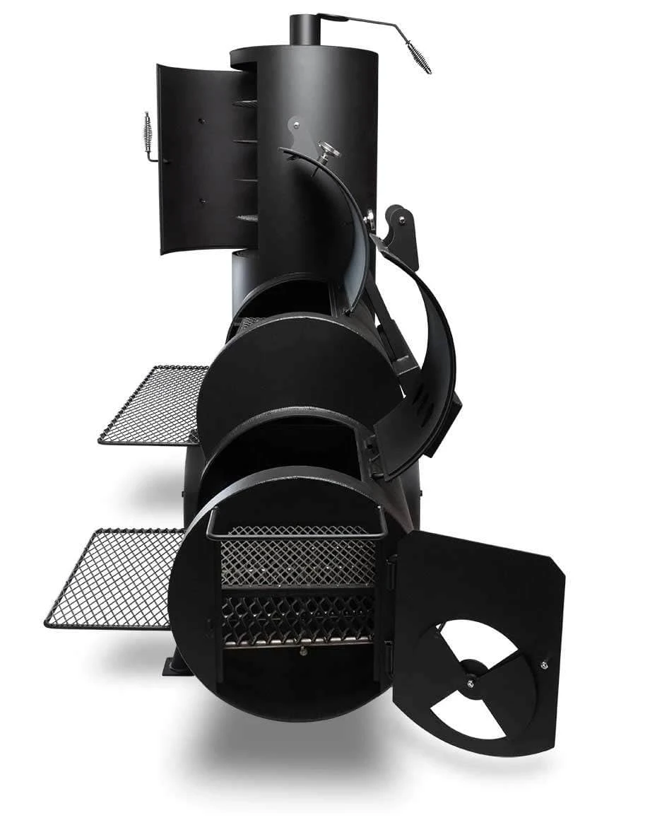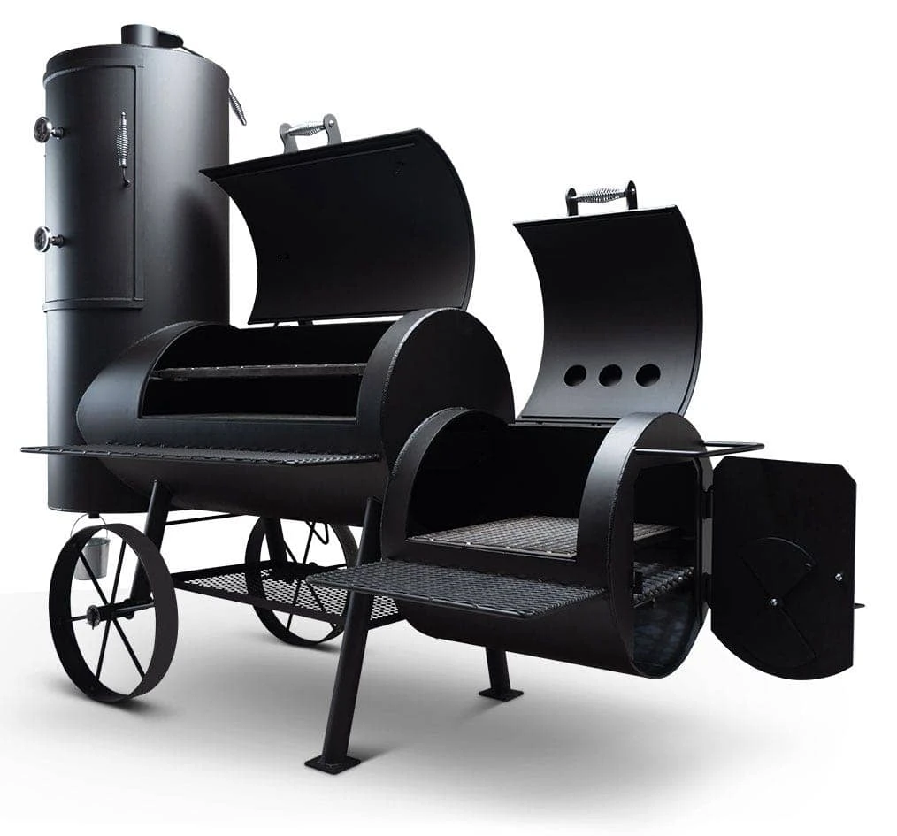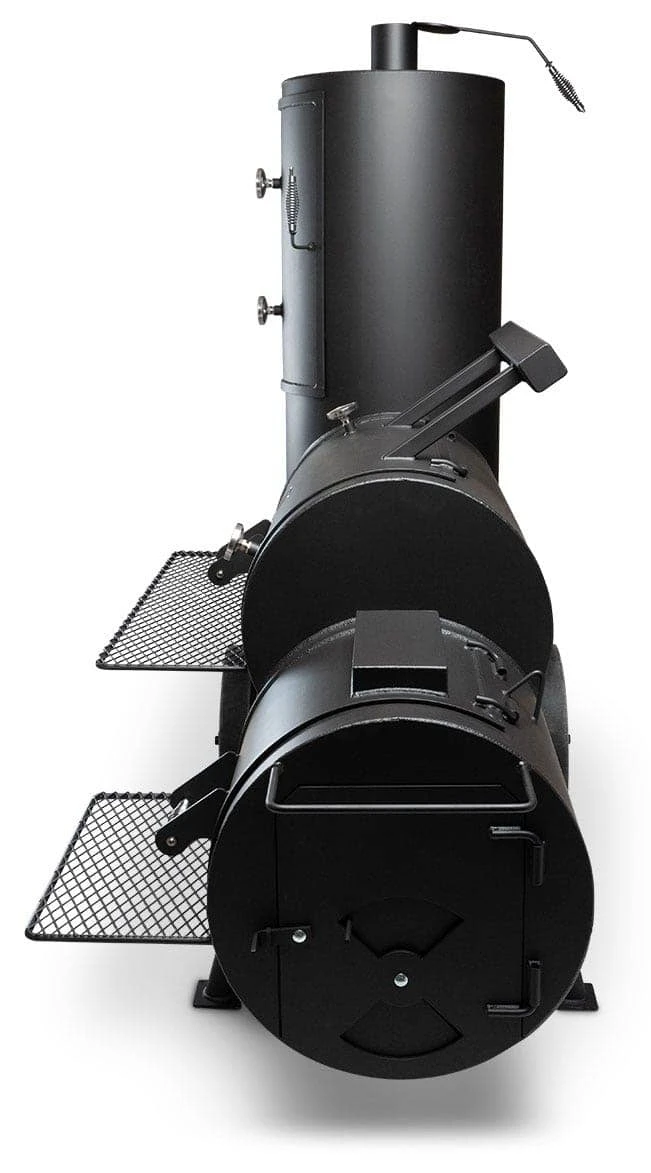 “The Durango” is the Swiss Army Knife of barbecue pits, it will allow you to slow smoke sausage, cheese, fish & jerky in the vertical chamber, barbecue ribs, pork, brisket & chicken in the horizontal chamber and grill steaks, burgers and hot dogs in the firebox all at the same time. From hors d’oeuvre to the main course, a great time is served. This is the 24″ model for larger gatherings and comes loaded out with all the options (counterweight, second shelf, heat management). The Durango gives new meaning to “getting the party started.”