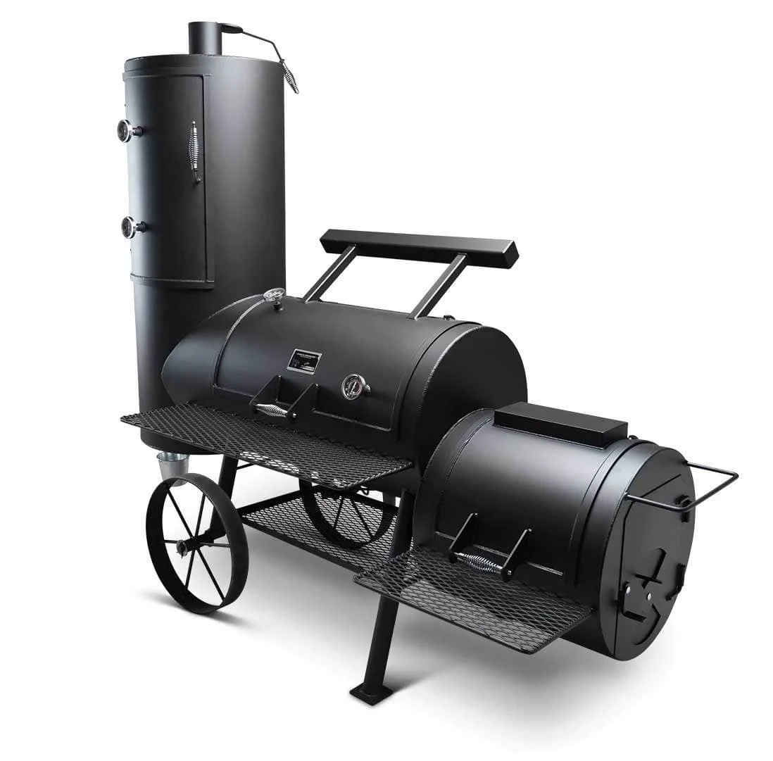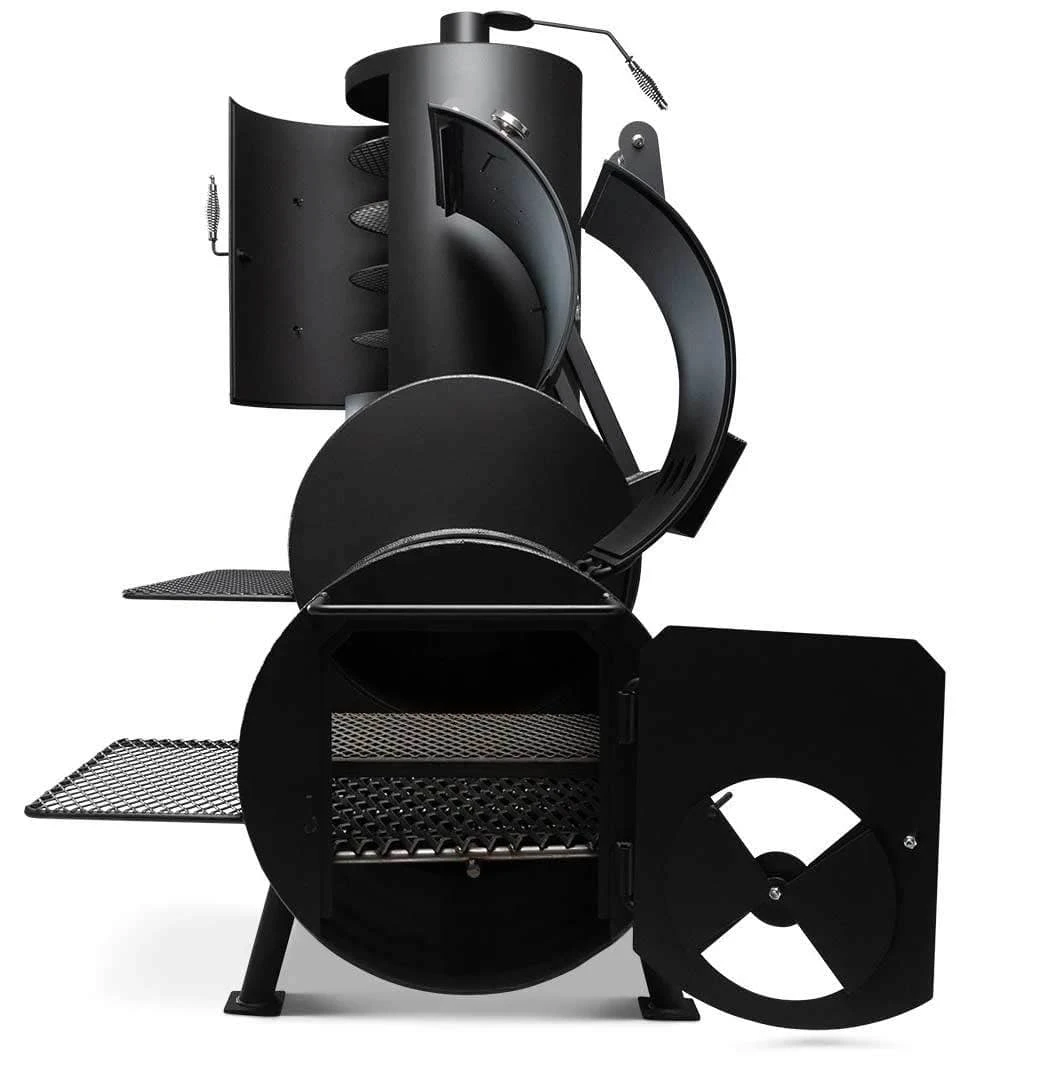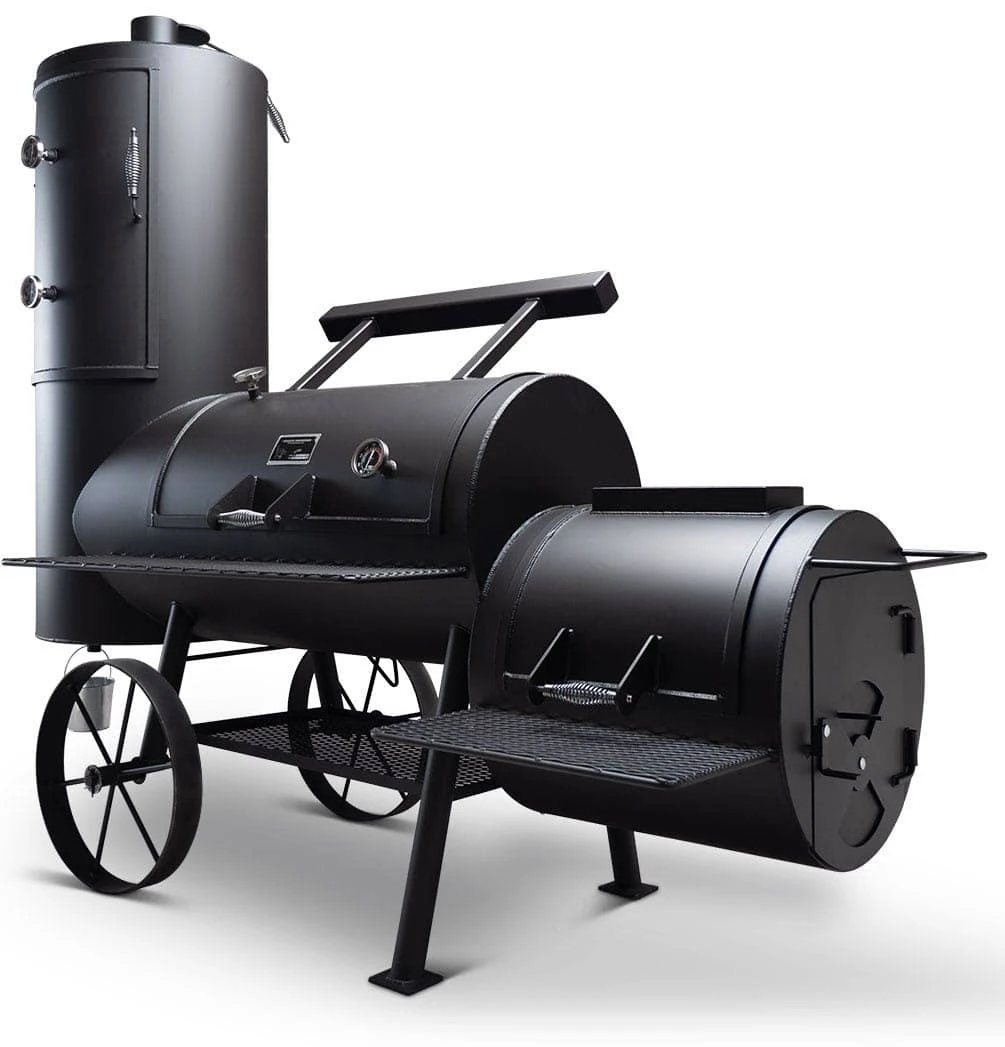 “The Durango” is the Swiss Army Knife of barbecue pits, it will allow you to slow smoke sausage, cheese, fish & jerky in the vertical chamber, barbecue ribs, pork, brisket & chicken in the horizontal chamber and grill steaks, burgers and hot dogs in the firebox all at the same time. From hors d’oeuvre to the main course, a great time is served. This is the 24″ model for larger gatherings and comes loaded out with all the options (counterweight, second shelf, heat management). The Durango gives new meaning to “getting the party started.”
