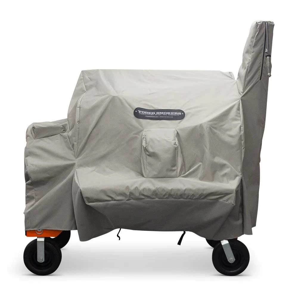 This heavy-duty custom fit cover from Yoder Smokers is designed to fit the YS1500 and YS1500s pellet cookers. The cover fits over the shelves and pellet hopper as well as the cart.