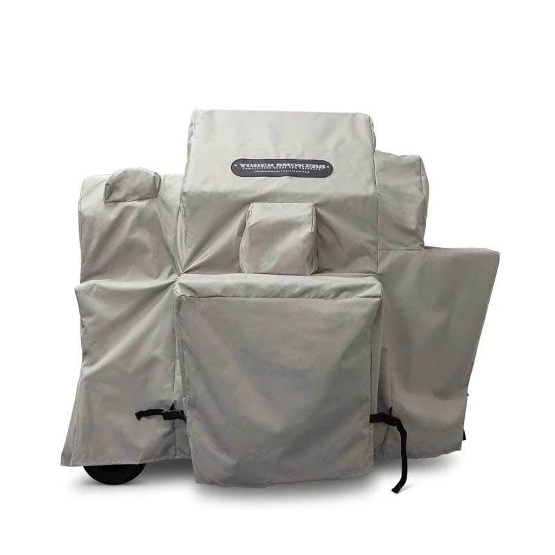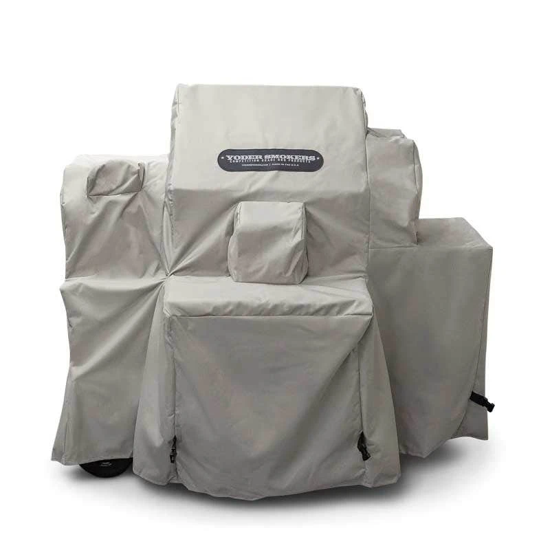 This heavy-duty custom-fit cover from Yoder Smokers is designed to fit the YS480 and YS480s pellet cookers on competition carts (note: this does not fit a standard cart). The cover fits over the shelves and pellet hopper as well as the cart; the chimney stack will need to be turned down to accommodate the cover. It installs quickly and easily making it a hassle-free way to protect your investment from the elements. This cover has buckles on each side to tighten it into place.
